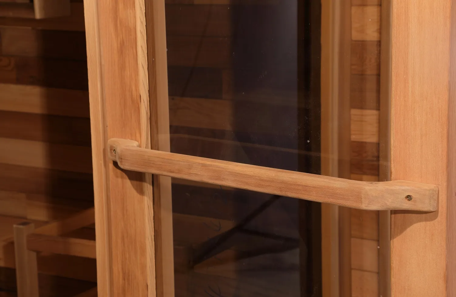 - అటవీ-ప్రేరేపిత అవుట్డోర్ సౌందర్యం: పదునైన ఘర్షణలను నివారించడానికి గుండ్రని వంకర అంచులతో సహజ కలప రంగును స్వీకరిస్తుంది. పెద్ద-ఏరియా టెంపర్డ్ గ్లాస్ డోర్తో జత చేయబడింది, ఇది పేలుడు నిరోధక భద్రతా పనితీరును అందిస్తూ పారదర్శకతను పెంచుతుంది. ప్రాంగణాలు మరియు డాబాలు వంటి బహిరంగ దృశ్యాలతో సజావుగా ఏకీకృతం చేయడం, ఇది ఆవిరి స్నాన స్థలంగా మాత్రమే కాకుండా మీ బహిరంగ ప్రకృతి దృశ్యానికి హైలైట్గా కూడా పనిచేస్తుంది.