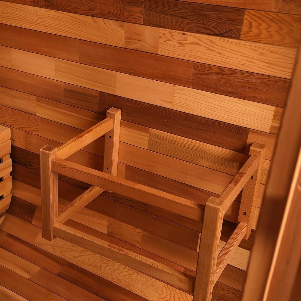 - ప్రధాన మెటీరియల్: అధిక-నాణ్యత వేడి-నిరోధక ఘన చెక్కను అంతటా ఉపయోగిస్తారు (గోడలు, బెంచీలు మరియు ఫ్రేమ్ అన్నీ ఘన చెక్క), అధిక-ఉష్ణోగ్రత మరియు అధిక తేమతో కూడిన ఆవిరి వాతావరణానికి అనుగుణంగా తేమ మరియు వేడి నిరోధకత కోసం వృత్తిపరంగా చికిత్స చేస్తారు.