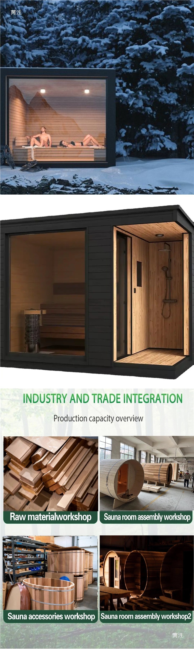 - లోతైన నలుపు లేదా బొగ్గు బూడిద రంగు బాహ్య కవచం ఒక ప్రొఫెషనల్ యాంటీ తుప్పు పూతను కలిగి ఉంటుంది, వర్షం, ఎండ మరియు కఠినమైన బహిరంగ పరిస్థితులకు నిరోధకతను కలిగి ఉంటుంది-ప్రాంగణాలు, క్యాంప్సైట్లు, లేక్సైడ్లు మరియు మరిన్నింటికి ఇది సరైనది. దాదాపు పూర్తి వాల్ ఫ్లోర్-టు-సీలింగ్ విండోలతో జత చేయబడిన సొగసైన మినిమలిస్ట్ లైన్లు ఆవిరి సెషన్ల సమయంలో గోప్యతను నిర్ధారిస్తాయి, అయితే సరస్సులు, పర్వతాలు మరియు అటవీ వీక్షణలను అడ్డంకులు లేకుండా ప్రదర్శిస్తాయి, ప్రకృతిని మీ విశ్రాంతి కోసం అంతర్నిర్మిత బ్యాక్డ్రాప్గా మారుస్తాయి.