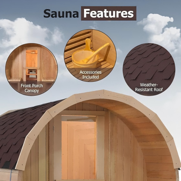 【అవుట్డోర్ సౌనా రూమ్】ఇది మన్నికైన కెనడియన్ హేమ్లాక్తో తయారు చేయబడింది మరియు వాతావరణ-నిరోధక షింగిల్ రూఫింగ్ మరియు తాజా గాలిని ఆస్వాదించడానికి మరియు చల్లబరచడానికి మీకు స్థలాన్ని అందించడానికి రెండు బయటి బెంచీలను కలిగి ఉన్న ముందు వరండా పందిరిని కలిగి ఉంది, ఇది బహిరంగ వినియోగానికి అనువైనది. దృఢమైన నిర్మాణం మరియు మూలకాలను తట్టుకునేలా నిర్మించిన మోటైన హేమ్లాక్ కలపతో, మీరు ఏడాది పొడవునా మీ ఆవిరి విశ్రాంతిని, వర్షం లేదా ప్రకాశాన్ని ఆస్వాదించవచ్చు.