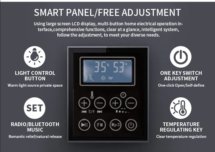 దిఅవుట్డోర్ గ్లాస్ డోర్ అవుట్డోర్ స్టీమింగ్ రూమ్బాహ్య-నిర్దిష్ట పెద్ద-పరిమాణ LCD ఇంటెలిజెంట్ కంట్రోల్ ప్యానెల్ (వాటర్ప్రూఫ్ మరియు డస్ట్ప్రూఫ్ డిజైన్)తో అమర్చబడి ఉంది, "ఒక-కీ నియంత్రణ" అనుకూలమైన ఆపరేషన్ను గ్రహించడం: